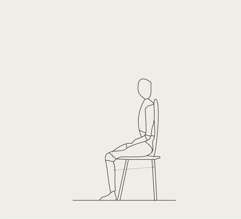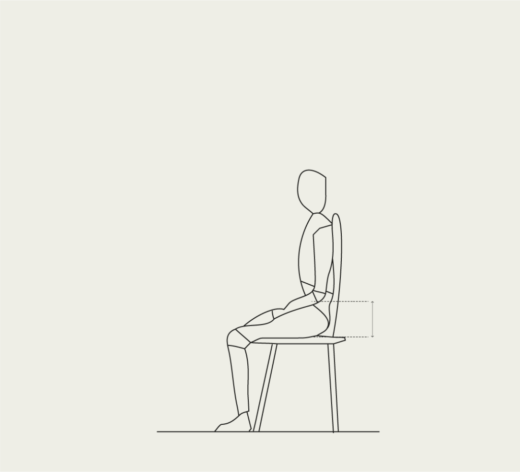 Meet voor de bovenbeenlengte vanaf de zijkant, van achter naar voor. Diepste punt rug(leuning) tot in de knieholte. (Maat/rolmaat niet buigen maar recht projecteren.) Voor de onderbeenlengte meten we vanaf onderzijde zool (meest gedragen schoenen) tot aan hoogste punt in de knieholte. De juiste zithoogte moet er voor zorgen dat de hakken de grond goed raken. Deze ondersteuning is essentieel om goed te kunnen zitten!